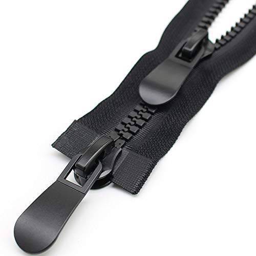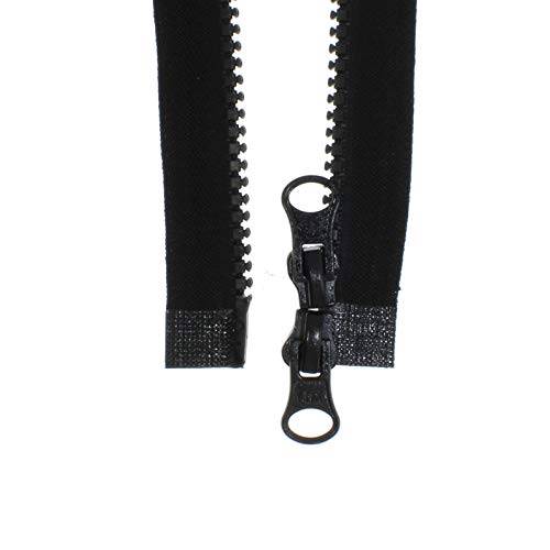 Ein wasserdichter 2-Wege-Reißverschluss verdeckt die Zähne und besteht aus beschichtetem Kunststoff. Er wird zum Beispiel für Regenjacken oder Motorradjacken von Online-Tests gängiger 2-Wege-Reißverschlüsse empfohlen.