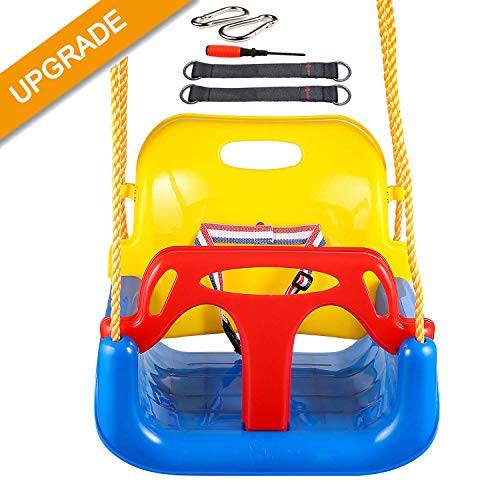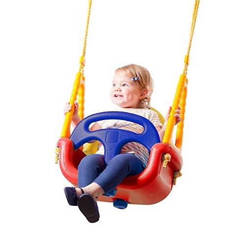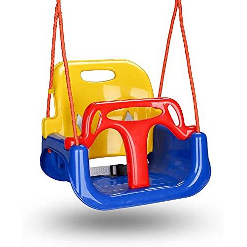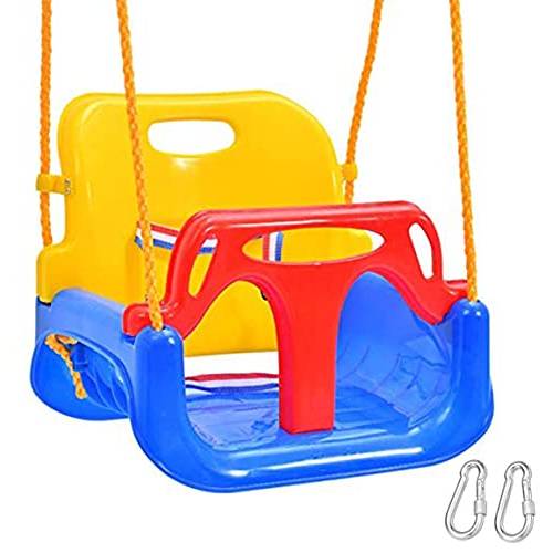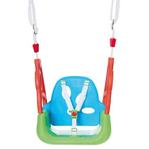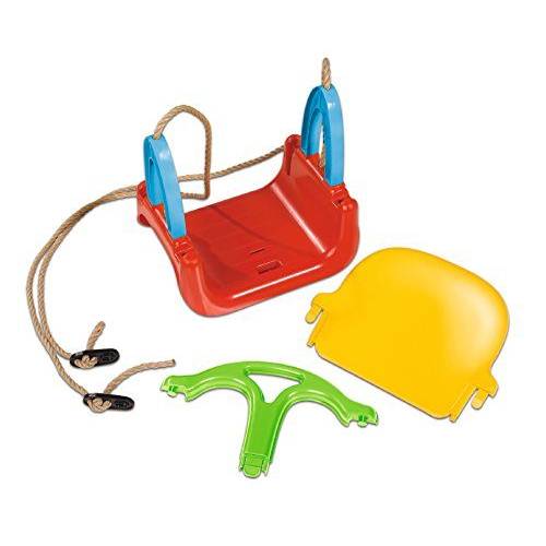Eine Schaukel mit dem Zusatz 3-in-1 lässt sich auf drei verschiedene Arten nutzen. Dank einer raffinierten Konstruktion können Rückenlehne und Rausfallschutz abgenommen werden. So lässt sie sich beispielsweise komplett mit allem oder ohne Zusätze verwenden.