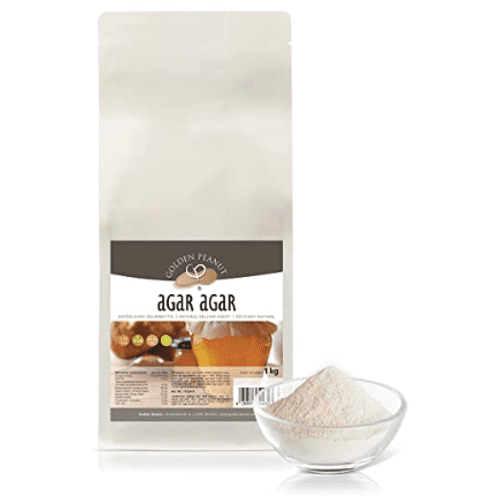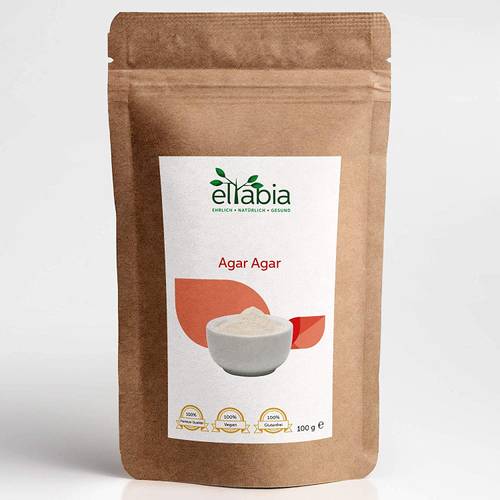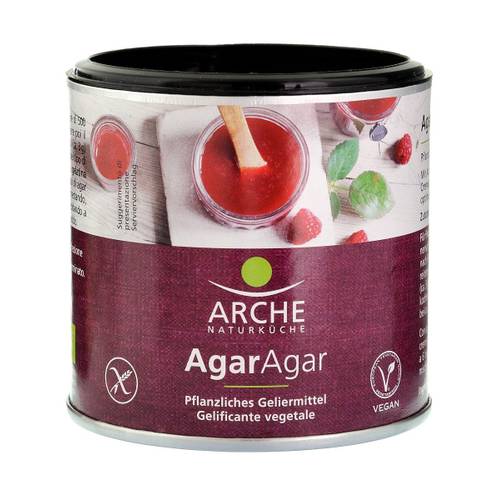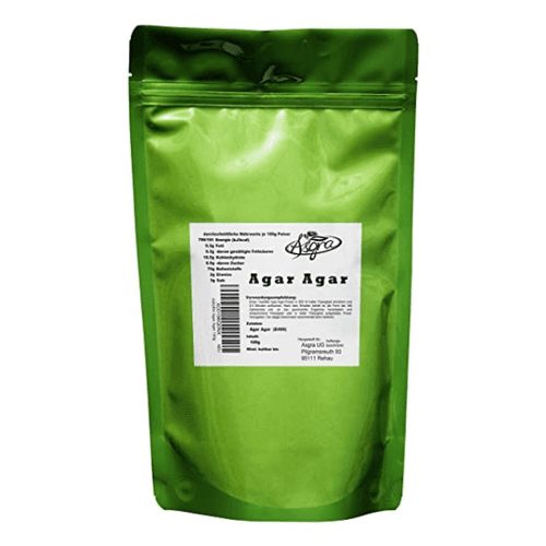 Agar-Agar ist ein helles Pulver, das aus Rotalgen hergestellt wird. Es besteht zu 70 % aus Agarose und zu 30 % aus Agaropektin und wird als Verdickungsmittel oder Gelatine-Ersatz verwendet. Alternativ eignet sich auch Pfeilwurzelmehl.