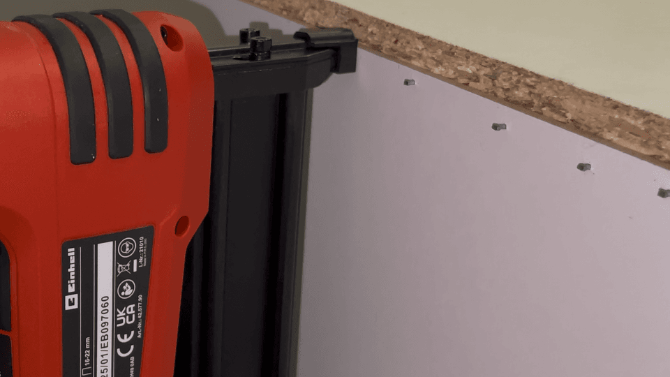 Der gezeigte Akku-Tacker bringt Klammern präzise in MDF-Platten ein – ideal für Möbelbau und stabile Verbindungen bei Innenausbau-Projekten.