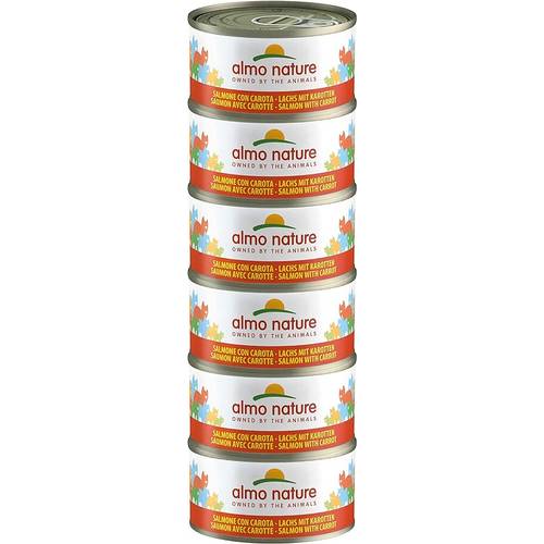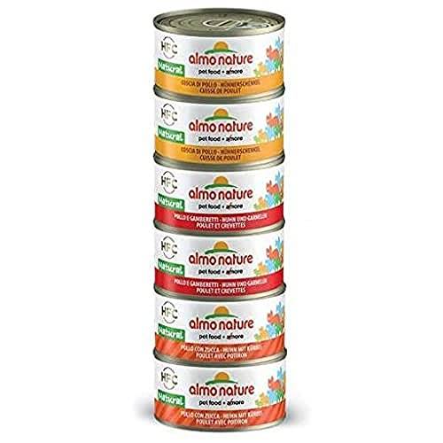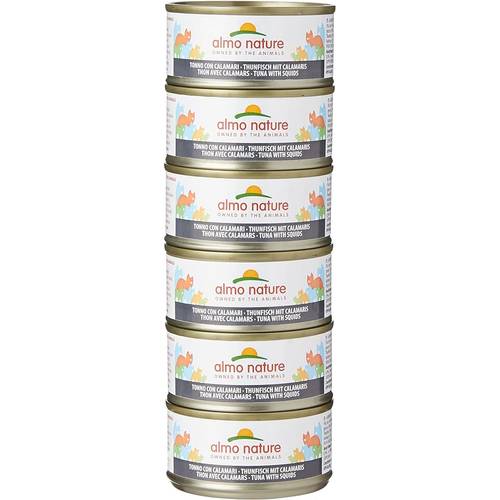 Wie wir feststellen, gibt es allein sechs verschiedene Thunfisch-Sorten, dieses Almo-Nature-Katzenfutters.
