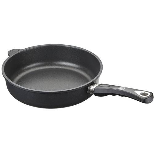 Einige Aluguss-Pfannen verfügen über einen abnehmbaren Griff. So können Sie den Kunststoffgriff trennen und die Pfanne bei höheren Temperaturen (in der Regel bis 200 °C) in den Backofen stellen. Die Marke Woll ist bekannt für ihre Pfannen mit abnehmbarem Griff.