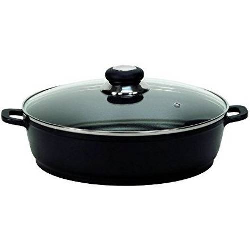 In Servierpfannen (z.B. 1-tlg mit einem ø von 36 cm) können Sie besonders große Speisemengen fertigen. Anders als herkömmliche Bratpfannen verfügen Modelle in dieser Kategorie über zwei Griffe und keinen Stil. Dadurch wird der Transport der Pfanne stabilisiert, da Sie das Gewicht auf beide Hände gleichmäßig verteilen. Aluguss-Servierpfannen können Sie nach dem Kochen auf den Tisch stellen und das Essen bleibt dank der guten Wärmeleitung länger warm.