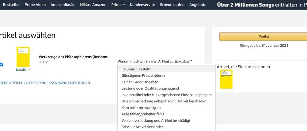 Gründe für eine Amazon-Rücksendung | Frist für die Rückgabe |