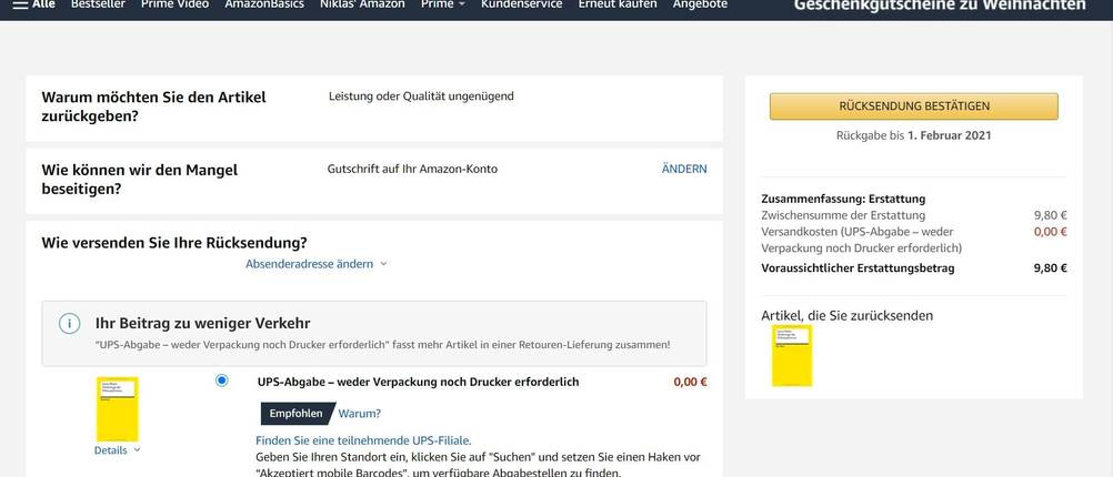 Der Preis für den Rückversand bei Amazon wird dann nämlich anteilig reduziert.