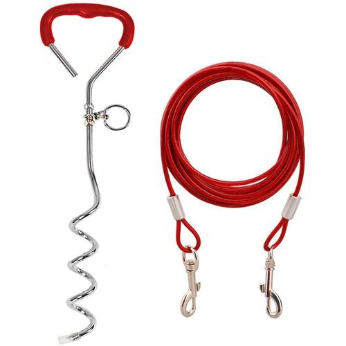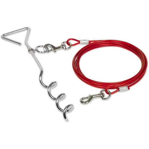Zum Lieferumfang dieses Nobby-Anlegepflocks gehört ein ummanteltes Stahlseil, mit dem sich der Hund sichern lässt, ohne dass er das Seil durchbeißen kann.