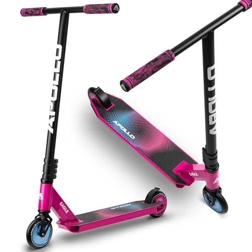 Möchten Sie einen Scooter von Apollo kaufen, um damit Stunts auszuführen, wählen Sie am besten einen Stuntscooter, der explizit darauf ausgelegt ist. Um Sicherheit bei Sprüngen und Drehungen zu garantieren, darf der Roller nicht zusammenklappbar sein. Unabhängige Online-Tests von Apollo-Rollern zeigen auch, dass der Lenker nicht verstellbar sein sollte. Auch das erhöht die Stabilität und Belastbarkeit des Stunt-Rollers.
