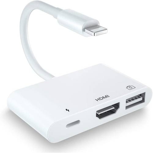 Lightning auf HDMI |  | Von Apple Lightning auf Digital-AV-Adapter: Mithilfe dieses kleinen Zubehörs ist es möglich, kombinierte Audio-Video-Signale weiterzugeben. Diese können mit Hilfe eines HDMI-Kabels dann z.B. auf einen Fernseher oder Beamer übertragen werden. Apples Original-Adapter hat zudem noch einen Lightning-Anschluss, sodass das Gerät während der Übertragung mit Strom versorgt werden kann. |