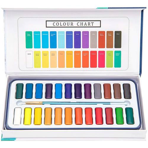 Das Set, das wir hier mit Hema-Aquarellfarben sehen, enthält 24 verschiedene Farbtöne, die sich ideal zum Mischen eignen.