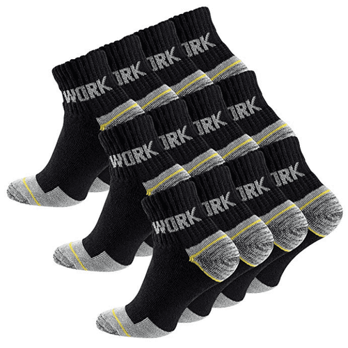 | Multifunktionale Socken für Damen und Herren | Können in Arbeitsschuhen mit und ohne Stahlkappe angezogen werden. Sie verfügen über verstärkte Sohlen, Fersen und Zehen und dämpfen den Fuß optimal. Die Socken können auch im Alltag oder zum Sport als Sportsocken getragen werden. |