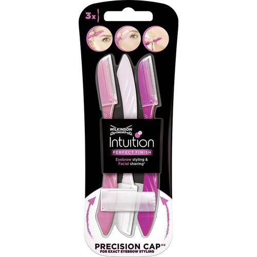 Dieser Packung Wilkinson-Intuition-Augenbrauenrasierer liegt eine Kappe bei, mit der sich die Klingenfläche verkleinern lässt, was wir praktisch finden.