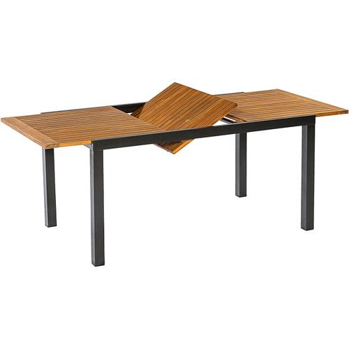 Kombiniert werden Massivholztischplatten, wie sie unter anderem bei Frohraum, Riess-Ambiente oder Tikamoon zu finden sind, idealerweise mit robusten Metall-Gestellen. Für einen Outdoor-Tisch bieten sich hierfür beispielsweise Edelstahl oder Alu an, wie beim 150-210×90-cm-Hartman-South-Wales-Ausziehtisch, der aus Aluminium und Teak besteht.