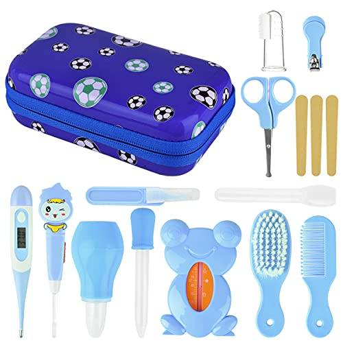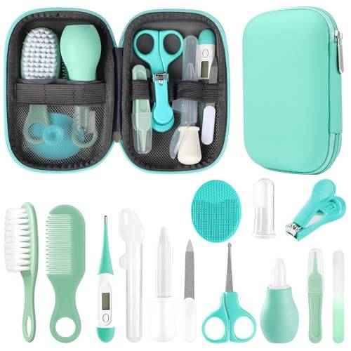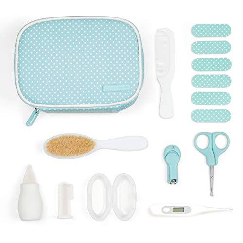 Laut unserer Recherche enthält dieses Babymoov-Baby-Pflegeset folgende Utensilien: Fieberthermometer, Badethermometer, Nagelknipser, Nagelfeile, Schere, Nasensauger, Beißring, Haarbürste und Zahnbürste.