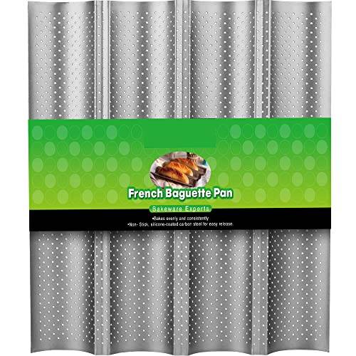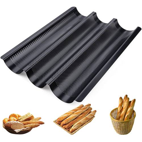 Eine Baguette-Backform dient dazu, aus Teig Baguettes herzustellen. Da dies lange und schmale Brotstangen sind, verfügen Baguette-Backbleche gegenüber klassischen Backblechen über etwa zwei bis vier schmale und voneinander getrennte Rillen, in welche der Teig gelegt wird. Diese sollen die längliche Form erhalten und gleichzeitig die einzelnen Baguettes voneinander trennen, um ein Zusammenbacken zu verhindern. Je nachdem, ob Sie mehrere große oder viele kleine Baguettes backen wollen, empfehlen sich Baguette-Backbleche für Mini-Baguettes oder normale 3er-Baguette-Backbleche mit großen Rillen.