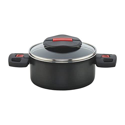Die Ballarini Click & Cook Saute-Pfanne hebt sich durch ihre platzsparenden, faltbaren Griffe und den vielseitigen Einsatz hervor. Aus dickem kaltgeschmiedetem Aluminium gefertigt, sorgt sie für eine schnelle und gleichmäßige Erwärmung, was in unserem Vergleich besonders für stetige Kochergebnisse wichtig ist. Die Keravis Antihaftbeschichtung bietet eine bemerkenswerte Bräunung und einfache Reinigung.