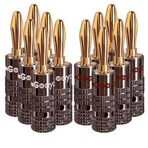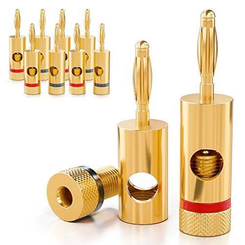 Alle Hersteller der Bananenstecker im Vergleich setzen auf Gold bzw. vergoldete Kontakte. Das edle Metall besitzt einen entscheidenden Vorteil für die elektrische Leitfähigkeit von Steckern und Buchsen: Es korrodiert nicht und verringert dadurch den Übertragungswiderstand, der sich durch jede Verbindung unterschiedlicher Materialien herstellt. Egal ob Sie ein Lautsprecherkabel durch Kupplung verlängern oder an einer Polklemme anschließen: Immer erhöht sich dabei der elektrische Widerstand. Aber auch die Korrosion des Kupfers ihrer Lautsprecherkabel senkt die Stromleitfähigkeit. Deshalb sollten Sie auf die Kupplung von Kabeln generell verzichten und stattdessen entsprechend lange Einzelkabel benutzen und die Kabelenden bestenfalls mit 24-karätigen vergoldeten Bananensteckern ausstatten für einen perfekten Sound im Heimkino-Sessel. Passende Bananenstecker (vergoldete Kontakte) bekommen Sie beispielsweise von Dynavox Perfect Sound, Speakersnap Banana, Bowers & Wilkins, Oehlbach Banana Solution und Black Forest Audio. Bananenstecker gibt es häufig als 4er-Set, was ungünstig ist, wenn Sie nur 1 – 2 Stück oder 6 Paar brauchen.
