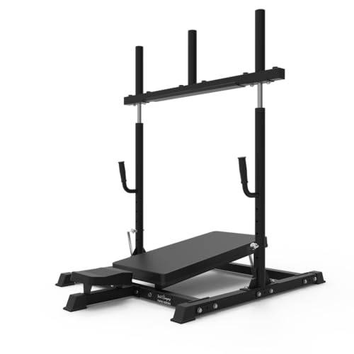 Beim Hackenschmidt stehen Sie auf Ihren Füßen und führen das Gewicht über Schulterpolster nach oben und unten. Das können Sie sich vorstellen wie gewöhnliche Kniebeugen, nur mit dem Unterschied, dass die Trainingsintensität durch die Gewichte natürlich erheblich gesteigert wird.