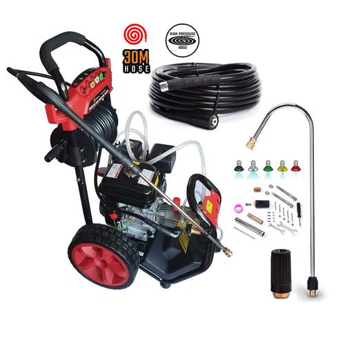 Hochwertige Benzin-Hochdruckreiniger verfügen über Schnellwechsel-Düsen. So können Sie den Streuwinkel leicht ändern, um bessere Ergebnisse zu erzielen. Zudem ermöglicht ein benzinbetriebener Hochdruckreiniger mit einem langen Schlauch von mehr als 10 m, dass Sie sehr flexibel arbeiten können. Je schwerer ein Gerät und je unwegsamer das Gelände ist, desto wichtiger wird dieser Aspekt.