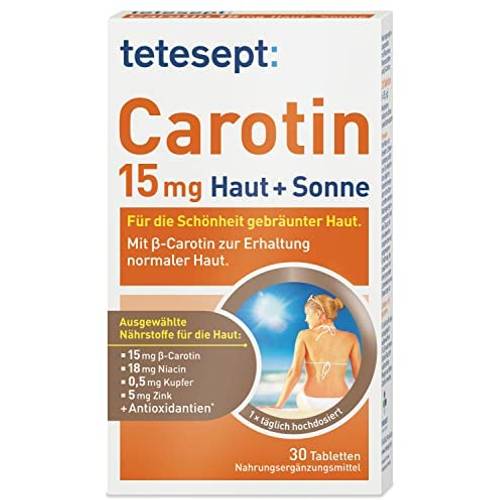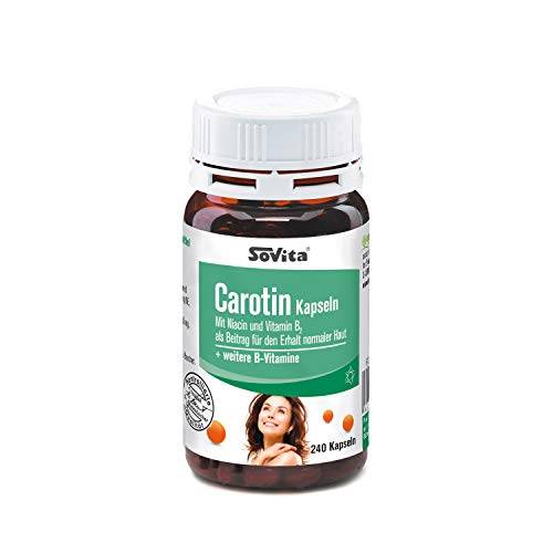 » Mehr InformationenBeta-Carotin wird häufig in Kombination mit einem Vitamin-B-Komplex dargereicht. Ein Vitamin-B-Komplex besteht aus verschiedenen B-Vitaminen, beispielsweise Vitamin B7 (Biotin), Vitamin B3 (Niacin), Vitamin B2 (Riboflavin) und weitere. Der Hersteller Abtei wirbt mit dem Begriff „hautaktive B-Vitamine“, doch dieser Begriff hat sich bislang bei weiteren Herstellern nicht etabliert. Wir vermuten, dass Abteil mit hautaktiven B-Vitaminen diejenigen B-Vitamine meint, die sich positiv auf die Haut auswirken. Das ist unter anderem Biotin als Vitamin B7 mit einer positiven Auswirkung für Haut, Haare und Nägel oder Niacin als Vitamin B3, das bei Hauterkrankungen unterstützend wirken kann.