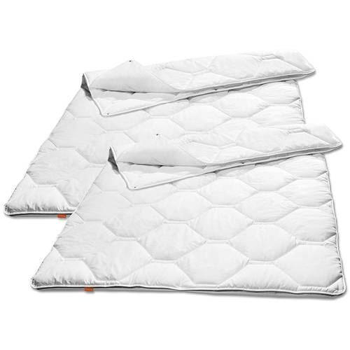 Die 4-Jahreszeitendecke besteht meist aus zwei Decken, die zusammen geknöpft werden können. Eine der beiden Decken ist ganz dünn, die andere mitteldick. Im Sommer nutzen Sie am besten nur die dünne Decke, für Frühling und Herbst ist die mittlere Variante gedacht. Im Winter knöpfen Sie die beiden Decken mittels angebrachter Druckknöpfe wieder zusammen und haben eine dicke Winterdecke. Sollten Sie für die Jahreszeiten unterschiedlich warme Decken bevorzugen, sollten Sie zur 4-Jahreszeitenbettdecke 135-200 greifen.