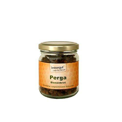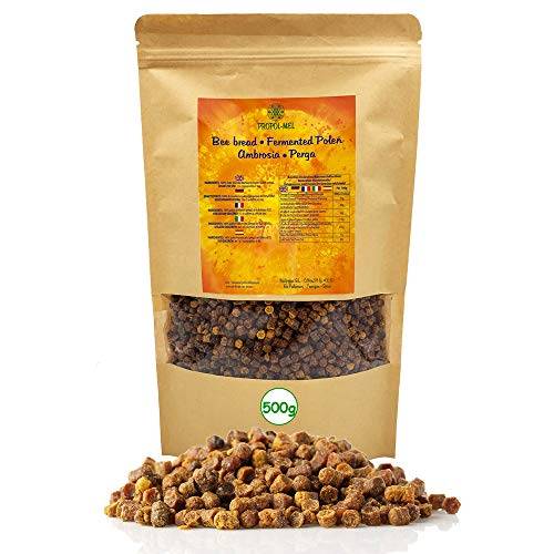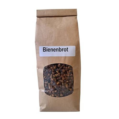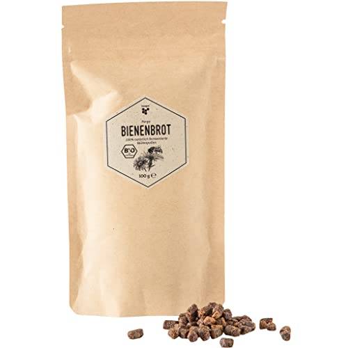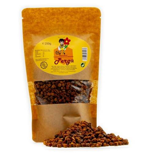Bienenbrot wird häufig auch Perga genannt und bezeichnet die Pollen, die nach dem Rundflug der Tiere nicht direkt verfüttert werden. Damit das Futter, das sie eigentlich für ihre Brut sammeln, frisch bleibt, konservieren sie die frischen Pollen mithilfe von Enzymen, Sekreten, Speichel, Propolis und Honig. Da sie die so konservierten Blütenpollen in Wabenzellen einlagern, entsteht die sechseckige Form, die ganz typisch für Bienenbrot ist. Die Vermischung bewirkt, dass die Pollen fermentieren und so länger haltbar sind. Achten Sie darauf, dass das Bienenbrot im Labor auf Rückstände geprüft wurde.