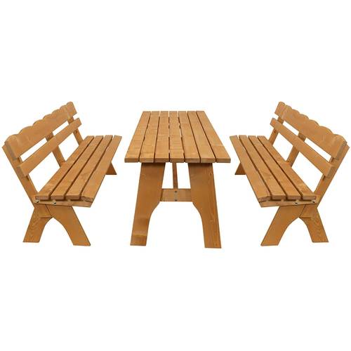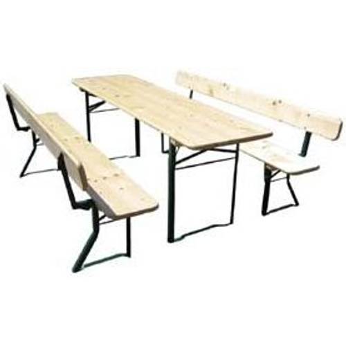 Eine Bierzeltgarnitur aus Holz wirkt weniger technisch und ansprechender als ein Modell mit Metallgestell. Sie passt im privaten Bereich gut auf die Terrasse oder in den Garten. Eine Bierzeltgarnitur mit Lehne in Brauereiqualität besteht komplett aus Massivholz. Sie wird im Innen- und Außenbereich von Brauereien genutzt. Aufgrund ihres höheren Gewichts im Vergleich zu einer Garnitur mit Metallbeinen ist eine Bierzeltgarnitur aus Holz oft eine dauerhafte Lösung.