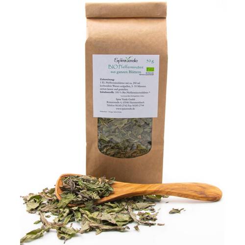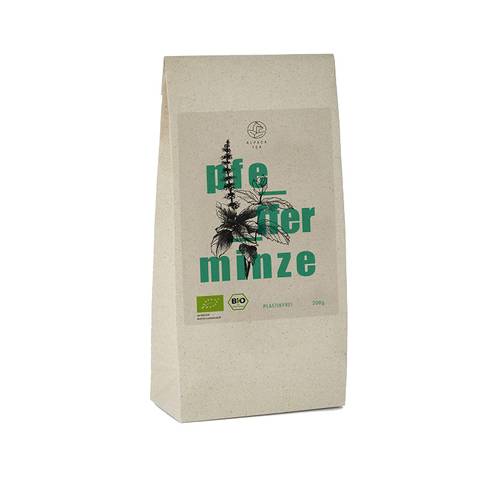 Pfefferminztee (bio) gibt es als losen Tee und als Beuteltee. Die getrockneten Minzblätter werden meist geschnitten und gehackt und können mit heißem Wasser zu Minztee aufgebrüht werden.