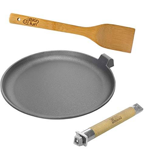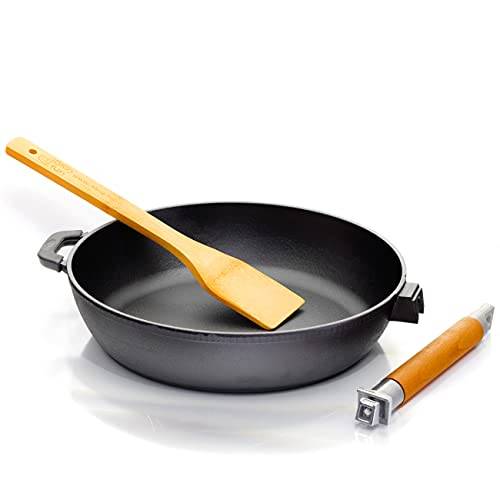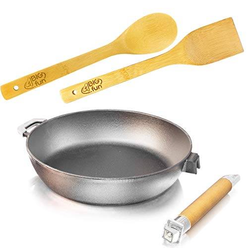 Kleiner Schwachpunkt des Materials: Wenn Sie schon mal eine Gusseisenpfanne in der Hand gehalten haben, ist Ihnen sicherlich aufgefallen, wie dick, schwer und massiv diese ist. Gerade auch BIOL-Gusseisen-Pfannen ab 28 cm Durchmesser bringen ein ordentliches Gewicht auf die Waage.