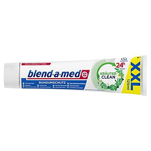 Die Blend-a-Med Zahnpasta „Kräuter Clean“ hier im Bild verspricht uns 24 Stunden Rundumschutz.