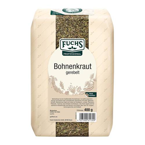 Hier sehen wir Wagner-Bohnenkraut gerebelt in einer Nachfüllpackung mit 20 g Inhalt.