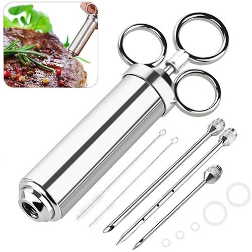 Die Wahl der richtigen Nadeln für die Bratenspritze ist entscheidend, um das Fleisch gut befüllen zu können. Sie bestehen meistens aus robustem Edelstahl. Empfehlenswert sind Bratensaftspritzen, bei denen die Nadeln getauscht werden können. Je nach Art des Lebensmittels oder der Konsistenz der Marinade kann so eine andere Nadelart zum Einsatz kommen:
