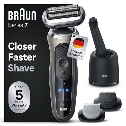 Series 7 | Auch die Rasierer der Braun Series 7 verfügen über den schwenkbaren, aus drei Teilen bestehenden Scherkopf. Zusätzlich zu diesen, aus Serie 5 bekannten Features, verfügen die Geräte der Braun Serie 7 dieser Modellreihe über weitere Funktionen. So ist der Mitteltrimmer mit der sogenannten ActiveLift-Technologie versehen, die auch flach liegende Haare erfassen soll. Zudem gibt der Scherkopf Schallwellen ab, welche dazu beitragen, die Barthaare aufzustellen. So wird es leichter, alles in einem Zug zu erfassen. Darüber hinaus verfügt die Serie über einen leistungsfähigen Akku und modellabhängig über Zubehör wie die Braun-Reinigungsstation und Wet & Dry-Technik. | ![]() |