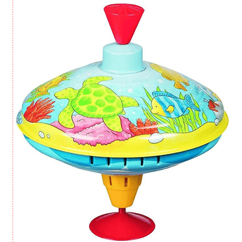 Das kann entweder durch einen Saugnapf gewährleistet sein oder durch eine nach unten hin breitere Bauweise. Wir empfehlen Ihnen außerdem darauf zu achten, dass der Griff des Kreisels möglichst breit ist, sodass Ihr Kind diesen gut in den Händen halten kann.