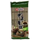 Hier werden uns Chunsi-Soba-Buchweizennudeln in einer 300 g Packung gezeigt, die in vier Portionen gebündelt sind.