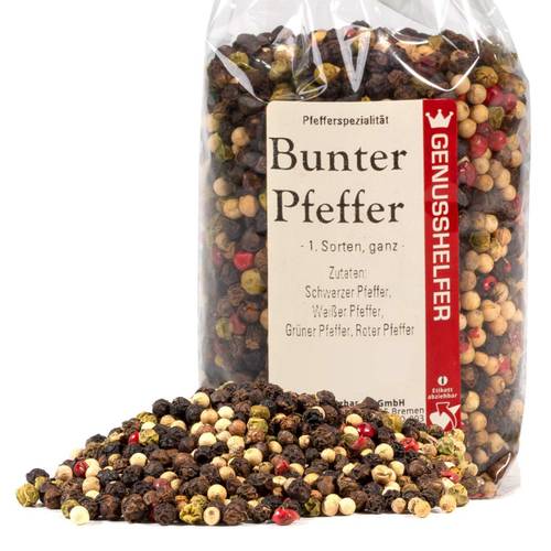 Die bunten Pfefferkörner sind in verschiedenen Größen erhältlich. Für personenreiche Haushalte empfehlen wir Ihnen, 500 g bis 1 kg bunten Pfeffer zu kaufen. Leben Sie in einem Single- oder Pärchenhaushalt, dann sollten 100 bis 250 g Pfeffer ausreichen.