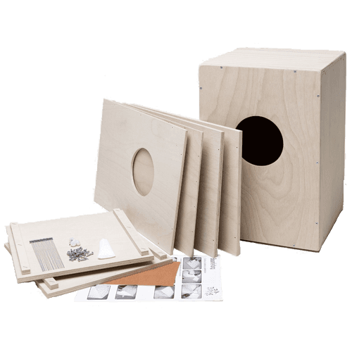 In einem Cajon-Bausatz sind alle Einzelteile und das gesamte Material wie Leim, Befestigungsgurte, Schrauben etc. für den Zusammenbau enthalten. Sie benötigen einen Akkuschrauber, um die Schrauben sicher und schnell einzudrehen. In der Regel dauert der Aufbau zwischen 30 Minuten bis 3 Stunden. Sie müssen keine besonderen Fähigkeiten als Schreiner haben, nur ein bisschen Geduld mitbringen. Der Bausatz eignet sich auch für das gemeinsame Zusammenbauen mit Kindern.
