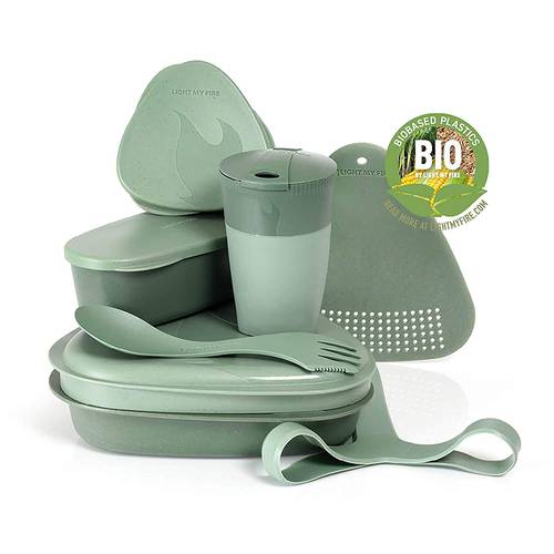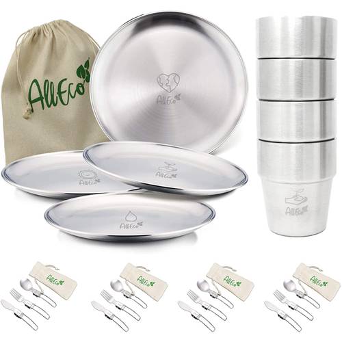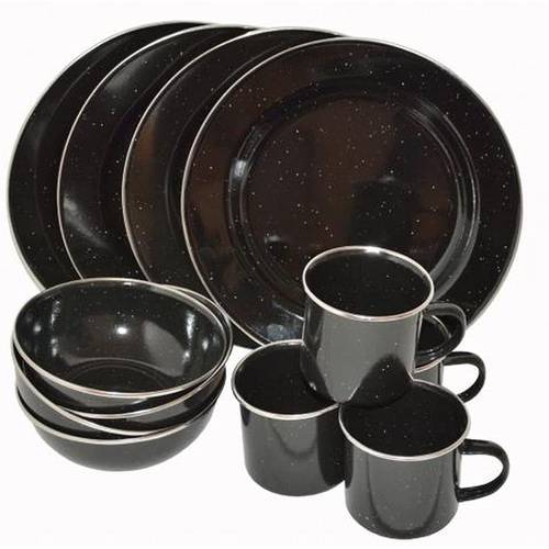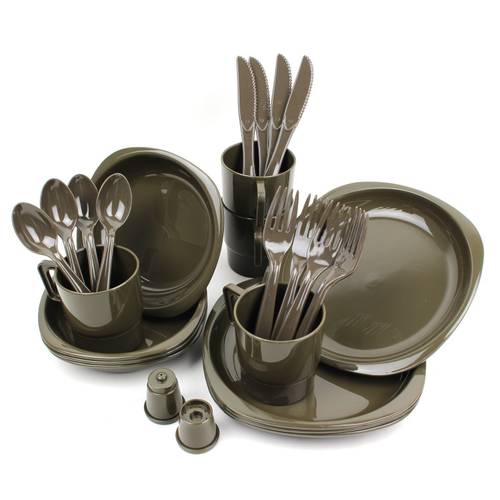 Leichtes Geschirr aus Metall ist meist teuer, hier haben sich Melamin und Bambus als leichte und preiswerte Alternativen hervorgetan, die einfach verstaubar sind. Da ein Melamin-Teller oder eine Emaille-Schüssel oft nicht ausreichen, wird das Camping-Geschirr meistens im Set angeboten.