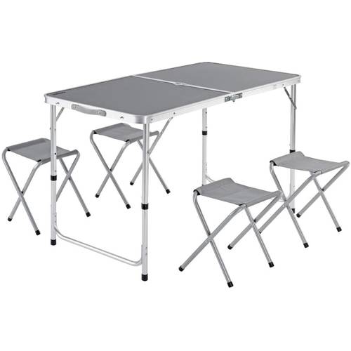 Hier sehen wir ein Quechua-Campingtisch-Set, das aus einem Tisch mit vier Klapphockern besteht.