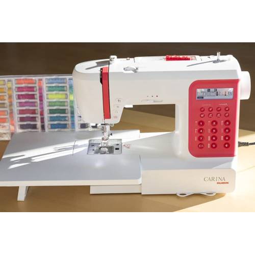 Vor dem Kauf einer Carina-Nähmaschine sollten Sie wissen: In jedem Lieferumfang einer Carina-Nähmaschine ist Zubehör enthalten. Dazu gehören unter anderem eine Staubschutzhülle, ein Paket Nadeln, ein Reinigungspinsel und ein Pfeiltrenner. Auch sind mindestens vier verschiedene Nähfüße, ein Kantenlineal und Greiferspulen mit von der Partie. Investieren Sie in die Carina Platinum, Carina Evolution oder Carina Revolution, erhalten Sie außerdem ein 64-teiliges Nähset. Bei der Professional 2.1. New Nähmaschine ist das Zubehör ebenfalls umfangreich. Hier gehören auch Schraubenzieher in verschiedenen Größen dazu, mit der Sie die Maschine nachjustieren können. Darüber hinaus bietet der Hersteller bei der Carina Nähmaschine Professional als Zubehör auch einen extra großen Anschiebetisch.