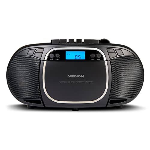 Wie wir hier sehen, ist dieser Medion-CD-Player mit Kassettendeck Teil einer Kompaktanlage, zu der zwei externe Lautsprecher gehören, die hier im Hintergrund erkennbar sind.