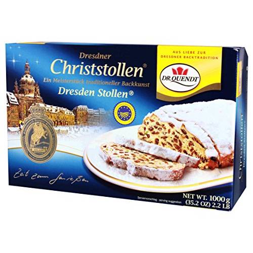 Die Dr. Quendt Dresdner Christstollen sind pro kg vergleichsweise günstig und enthalten Rosinen. Sie kommen ohne Konservierungsstoffe und Farbverstärker aus und haben einen relativ hohen Eiweißgehalt von 6,3 g.
