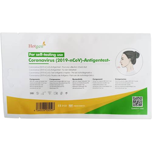 Corona-Selbsttest-Test: Nahaufnahme des Aufdrucks auf der Seite der Verpackung.