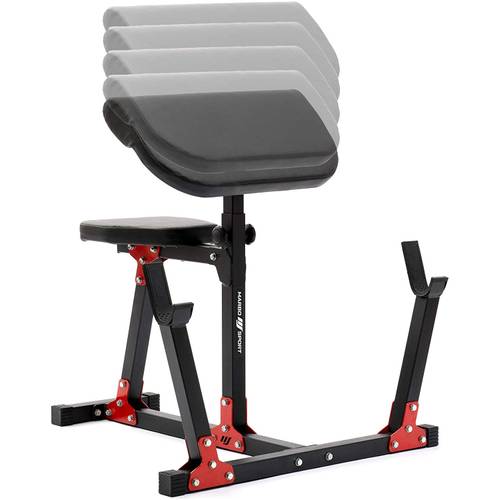 Eine Beinfixierungsrolle stabilisiert Ihre Position und verhindert Ausweichbewegungen, was die Trainingseffektivität steigert. Ein höhenverstellbares Curlpult passt sich verschiedenen Körpergrößen an und sorgt für ergonomisch korrekte Trainingspositionen.