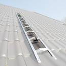 Hier sehen wir eine verzinkte, mobile Dachleiter, die mit Firsthaken befestigt ist. Sie sorgt für den Zugang zum Schornstein.