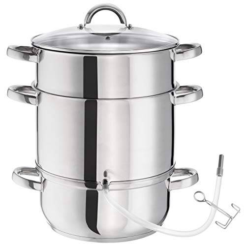Der Dampfentsafter von Könighoffer hat mit 8 l ein sehr großes Fassungsvermögen. Er ist aus Edelstahl und eignet sich für alle Herdarten. Gut finden wir die vergleichsweise hohe Saftausbeute. Der Entsafter ist spülmaschinenfest, das ist praktisch.