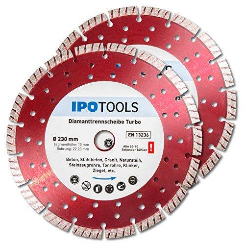 » Mehr InformationenAbhängig von den Diamantsegmenten (Tabelle unter Punkt 2.1.) können Sie grundsätzlich nahezu alle Arten an Materialien bearbeiten. In passender Variante ausgewählt, sind Sie auch in der Lage, mit der Diamanttrennscheibe 230 Ziegel zu schneiden. Wobei in diesem Fall auch ein Elektro-Sägesäbel mit passenden Sägeblättern gute Dienste leistet.