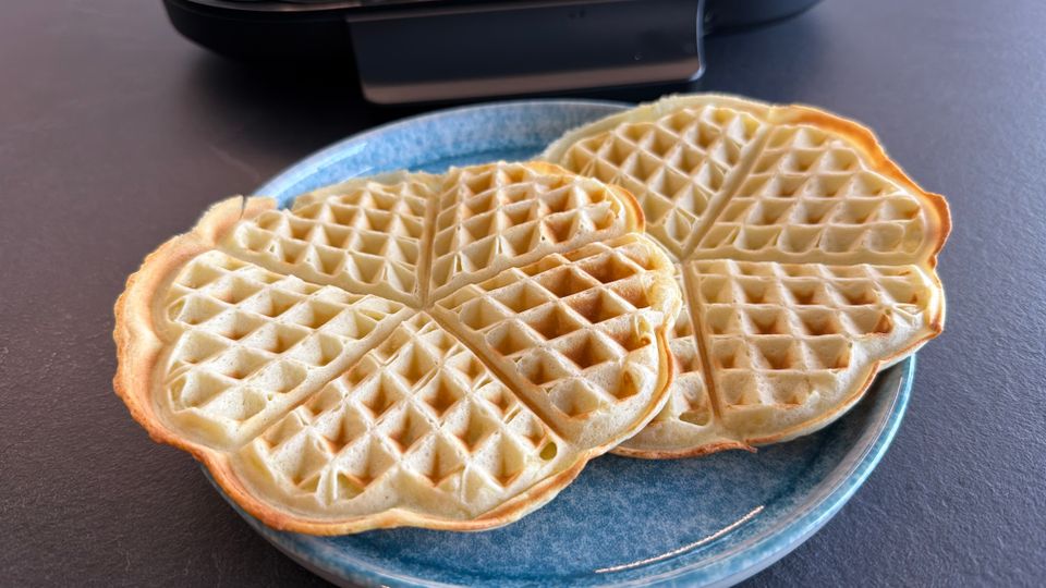Optisch bewerten wir das Ergebnis als gut, auch wenn die Bräunung noch gleichmäßiger hätte sein können. Vor allem geschmacklich überzeugen uns die rechteckigen, dicken Waffeln sehr. Außen sind sie angenehm knusprig und innen noch ein bisschen weich. Genau das erwarten wir von belgischen Waffeln.