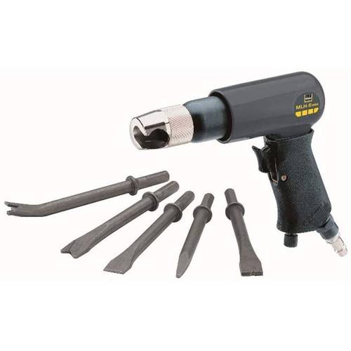 Die zusätzliche Kraft, die ein Druckluftmeißel bietet, können Sie ebenfalls mit einem Flachmeißel nutzen, um Fliesenbeläge zeitsparend und mühelos zu entfernen. Ein Druckluft-Meißelhammer kann ebenfalls zum Spalten von Blechen, Auspuffrohren und Karosserieteilen verwendet werden. Spezielle Meißel mit Hakenkanten lassen sich einsetzen, um eine saubere Linie durch das Metall zu schneiden. Bolzenabschlagmeißel können auch zum Durchtrennen festgefrorener Bolzen verwendet werden, und andere Werkzeugeinsätze können eine Vielzahl unterschiedlicher Aufgaben erledigen.