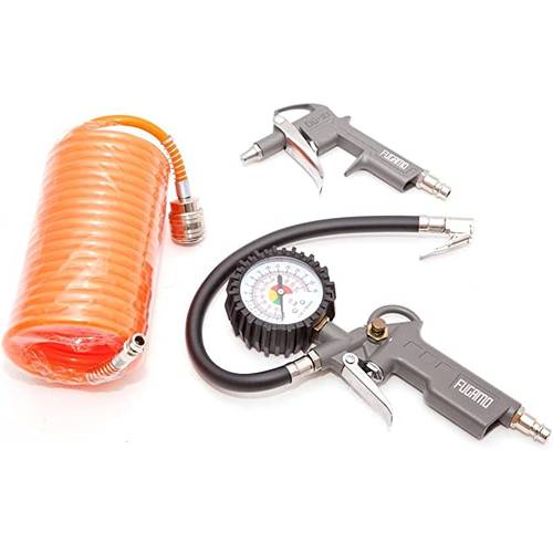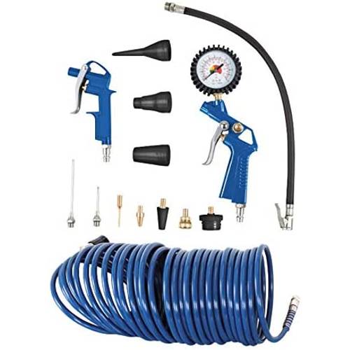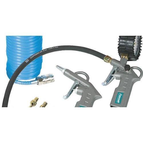 Der Schlauch beim Druckluft-Werkzeug-Set ist im Idealfall spiralförmig. Spiralschläuche ziehen sich nach Gebrauch automatisch zusammen und sparen dadurch Platz. Sie verhindern zudem, dass es zu Knicken und Knoten im Schlauch kommt, was Schäden vorbeugt. Bei einem Druckluftschlauch würde schon ein Haarriss ausreichen, um das Produkt völlig unbrauchbar zu machen.