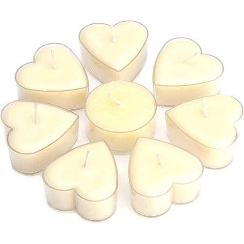 7 herzförmige Teelicher und 1 rundes Teelicht mit Muster